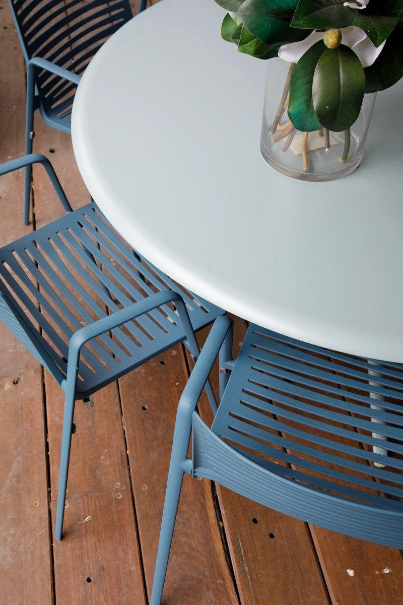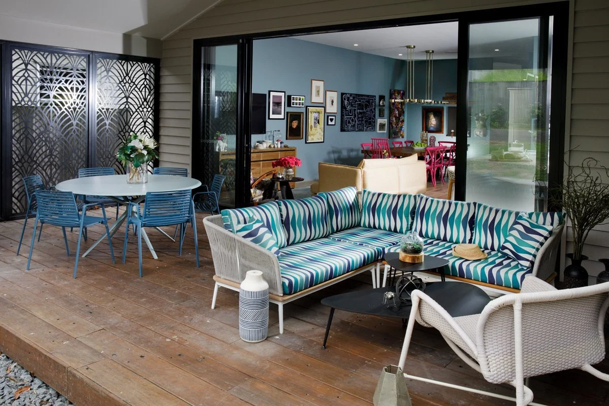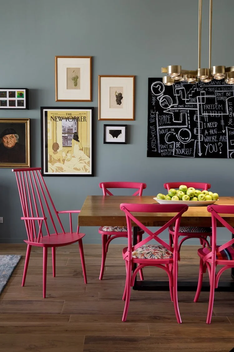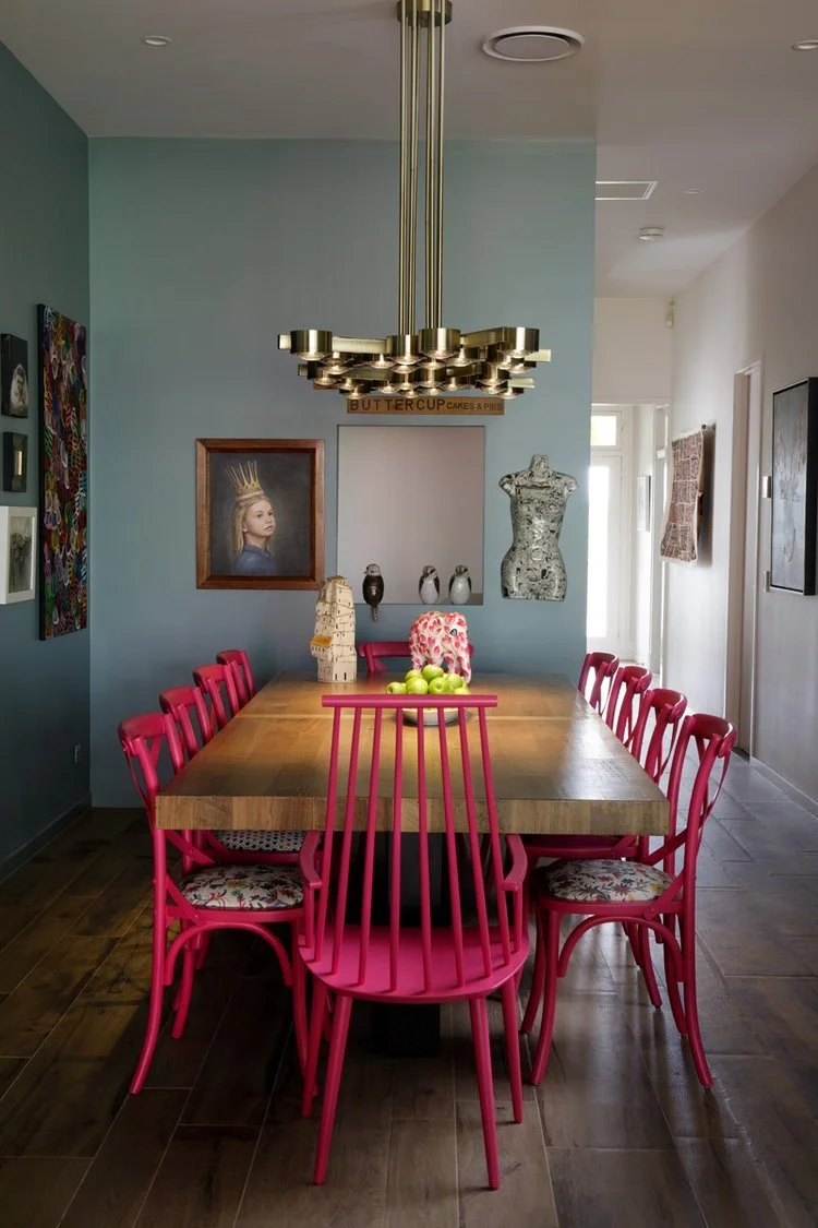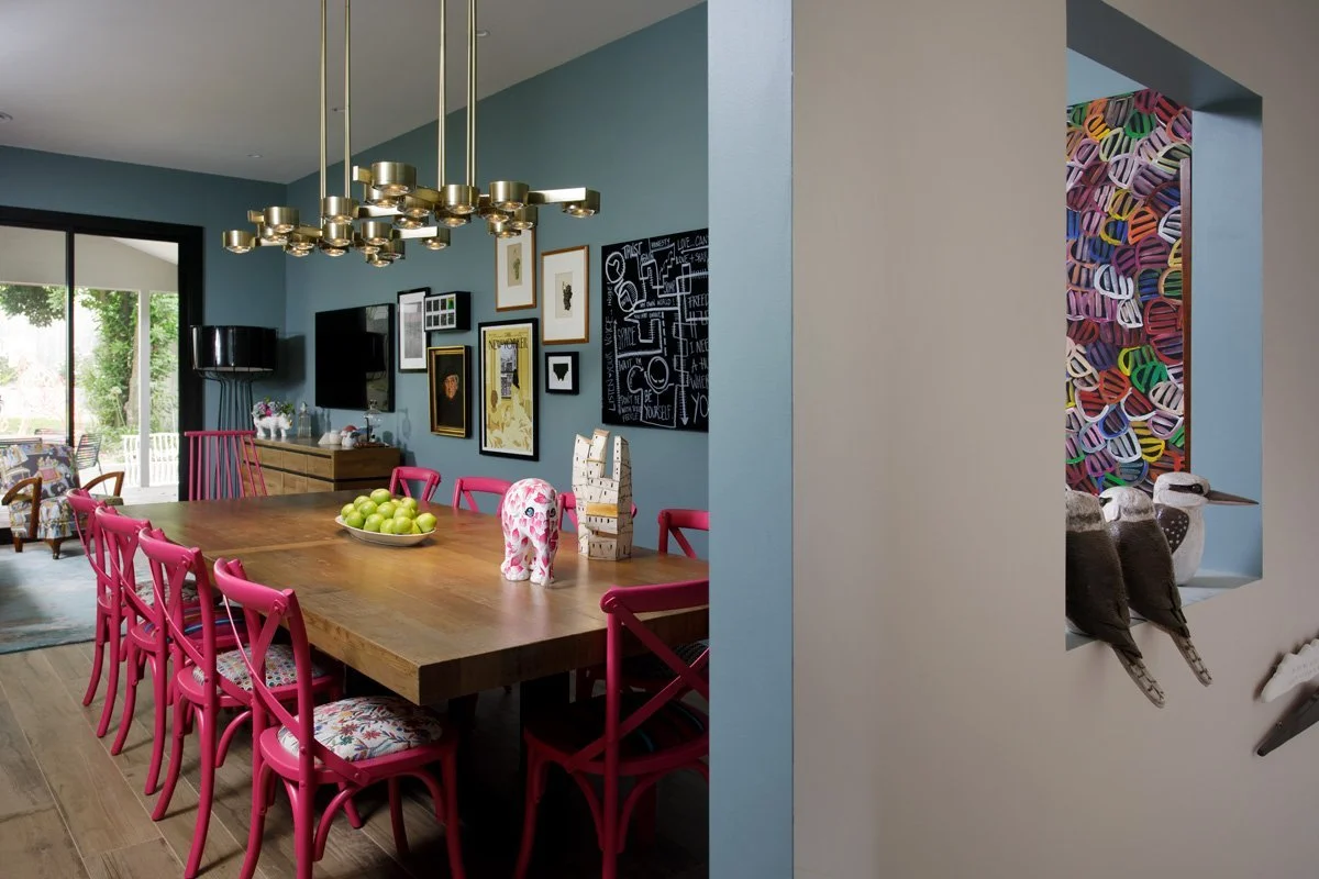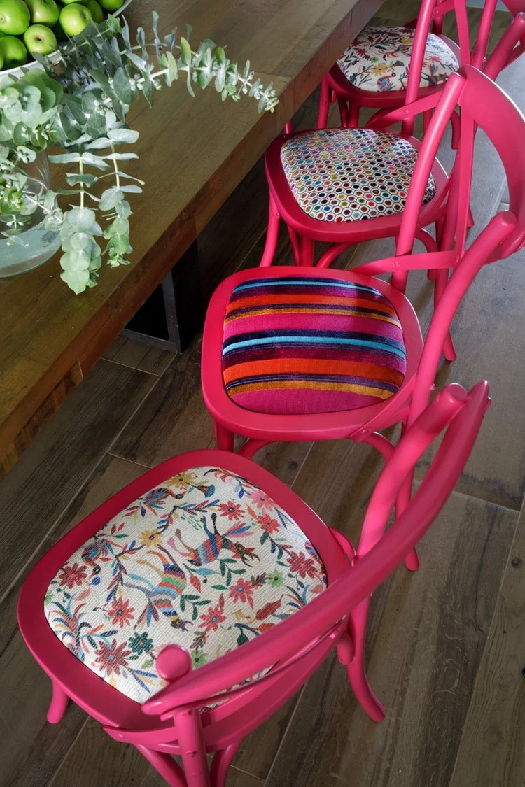 Some of the client’s existing furniture was customised to deliver statement pieces that added even more interest and intrigue to an already fascinating space. We refinished the yellow timber dining chairs to a blue based fuchsia pink and added a collection of complimenting fabrics via custom-made upholstery seat pads. The textiles selected were deliciously different, and together they worked.